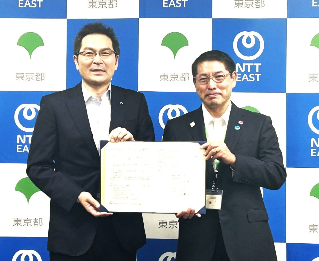 協定締結式の様子。NTT東日本の山口肇征執行役員(左)と東京都産業労働局の田中慎一局長。