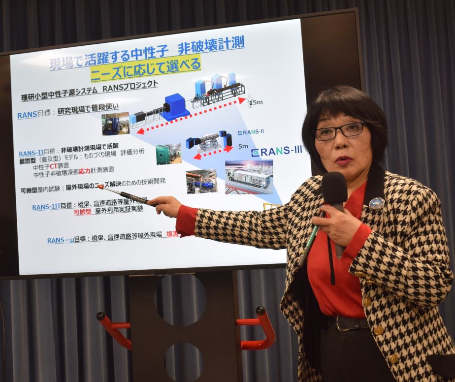 理研光量子工学研究センターの小林知洋専任研究員、池田裕二郎客員主管研究員、大竹淑恵チームディレクター、東京科学大学総合研究院ゼロカーボンエネルギー研究所の池田翔太助教らの共同研究チームは、現場で橋梁の内部劣化を非破壊計測できる可搬型小型中性子源システムRANS-Ⅲを開発し、中性子発生に成功した。加速部重量600㌔㌘(従来5㌧)、遮蔽部重量2㌧(20㌧)、全長4㍍(10㍍)と大幅に小型・軽量化してトレーラーに搭載できるようにした上、陽子線エネルギーを抑えつつも必要な中性子を発生させることで規制基準をクリアして、現場で中性子非破壊検査ができるようにした。大竹チームディレクターは「まずはトレーラーを入れられる専用の建屋内での各種実験を積み重ねていきます。来年の6月頃には土木研究所の鉄橋橋梁で、秋くらいには福島ロボットテストフィールドで屋外での実証試験を進めたい。(原子力規制庁への)変更申請が必要なので、手続き次第ですが、来年度末までには、実際の現場に持っていきたい」と話す。