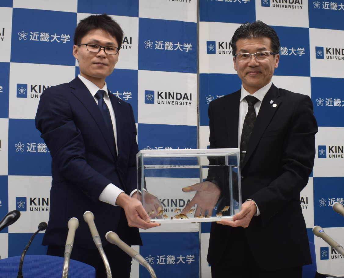 完全養殖ノドグロの稚魚が泳ぐ水槽を抱える家戸敬太郎教授(右)と中村尚隆技術職員