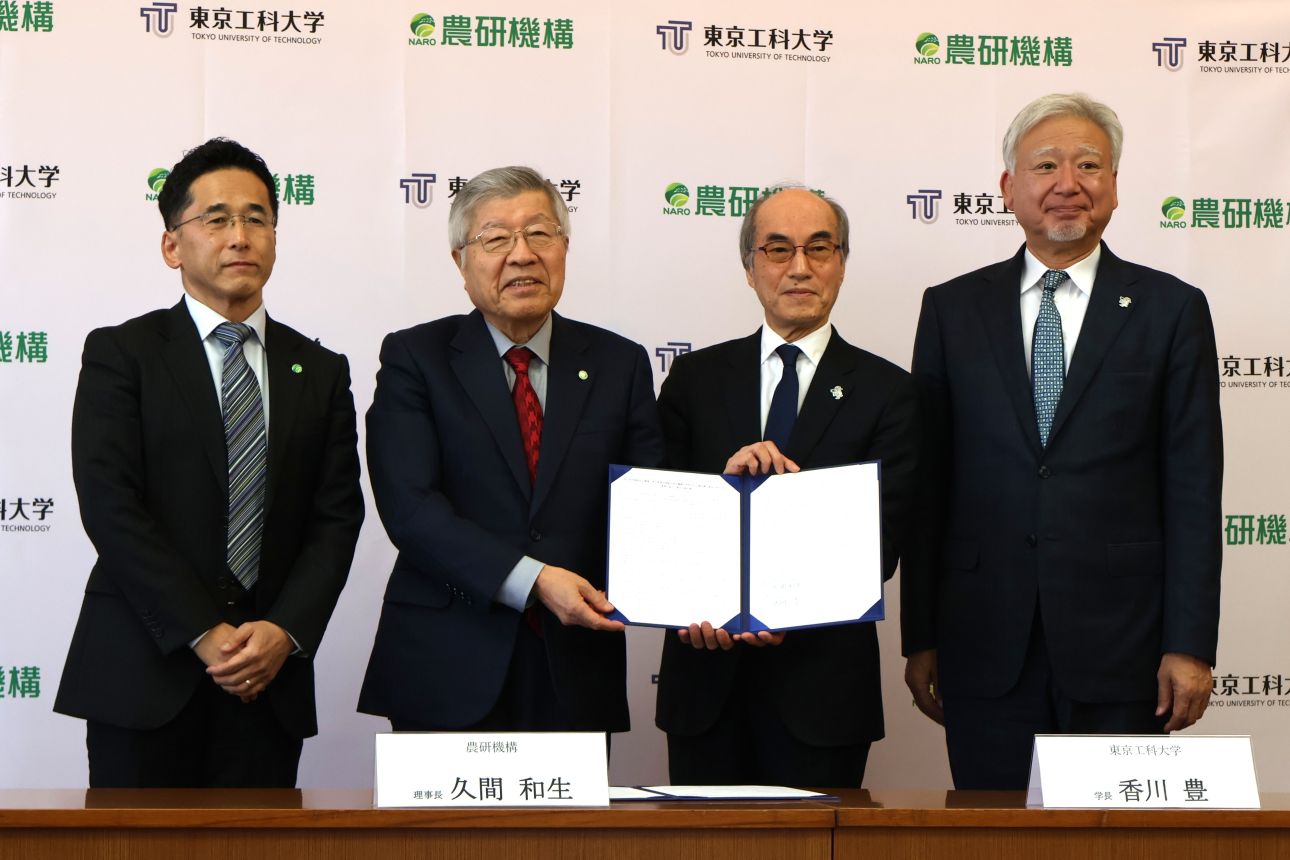 農研機構(久間和生理事長)と東京工科大学(香川豊学長)は2月19日、同大学蒲田キャンパス(東京都大田区西蒲田)で包括連携協定を締結した。両者の連携・協力によってロボティクスやドローン、AIなどを活用したスマート農業技術を創出するなど農業における課題解決を目指す。まずはシカを対象とした獣害低減システムの開発をはじめとした3課題の共同研究を開始する。
