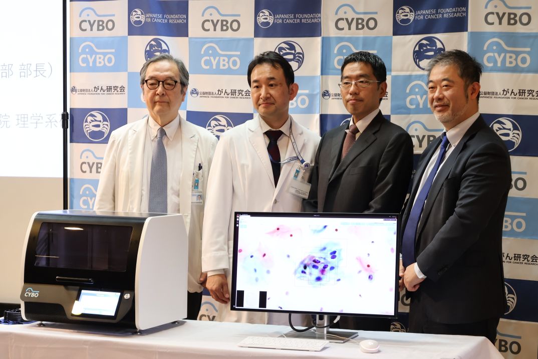 左から、がん研有明病院の佐野武病院長、千葉知宏部長、CYBOの新田尚社長、合田圭介取締役。手前の台に置かれているのはデジタル細胞診システム「CYBO Scan」